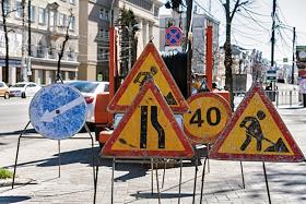 Жанровая фотография. Дорожные знаки перед участком дороги, в пределах которого проводятся ремонтные…