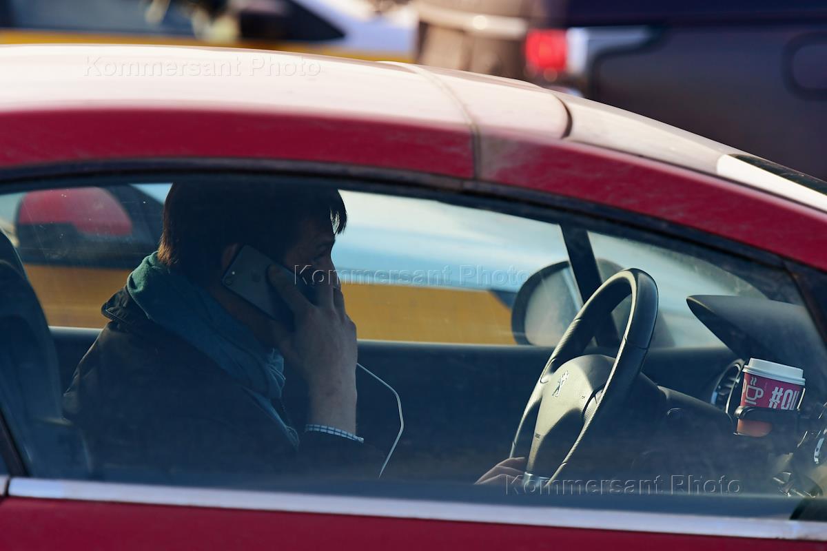 Жанровая фотография. Водитель автомобиля каршеринга разговаривает по мобильному телефону за рулем.