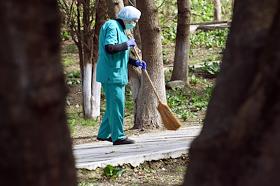 Жанровая фотография на тему коронавируса. Дворник на территории больницы в медицинской маске.