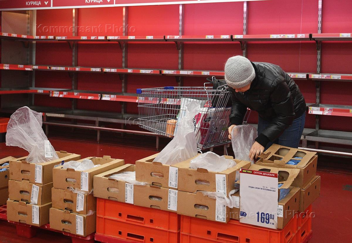 Жанровая фотография. Покупатели у пустых полок гипермаркета Metro Cash&Carry (МЕТРО кеш энд кэрри).