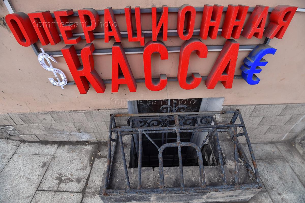 Жанровая фотография. Знак "Операционная касса" на фасаде дома и логотипы доллара и евро.