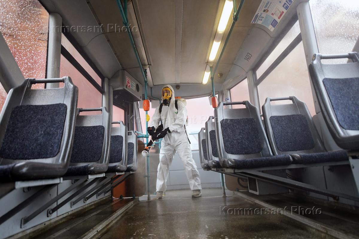Этапы дезинфекции подвижного состава компании "Горэлектротранс" в Трамвайном парке №1. Сотрудник…