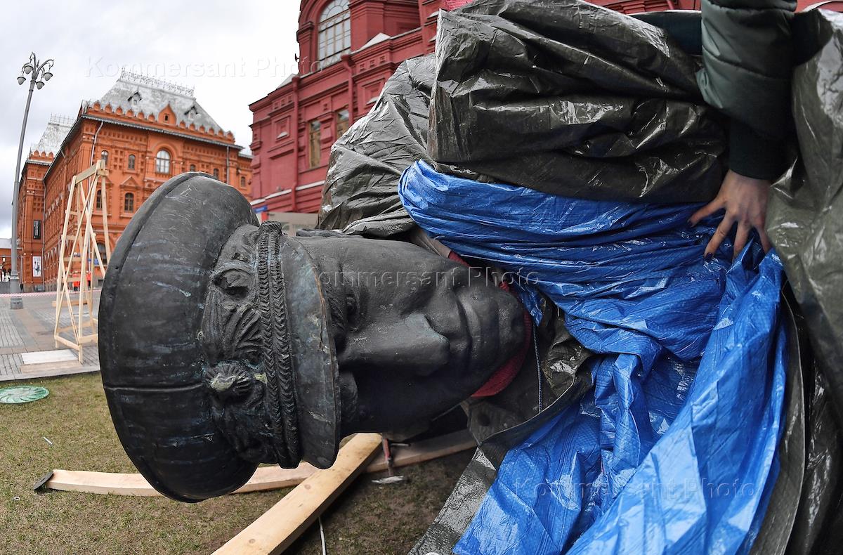 Замена памятника маршалу Георгию Жукову перед Историческим музеем на Манежной площади.