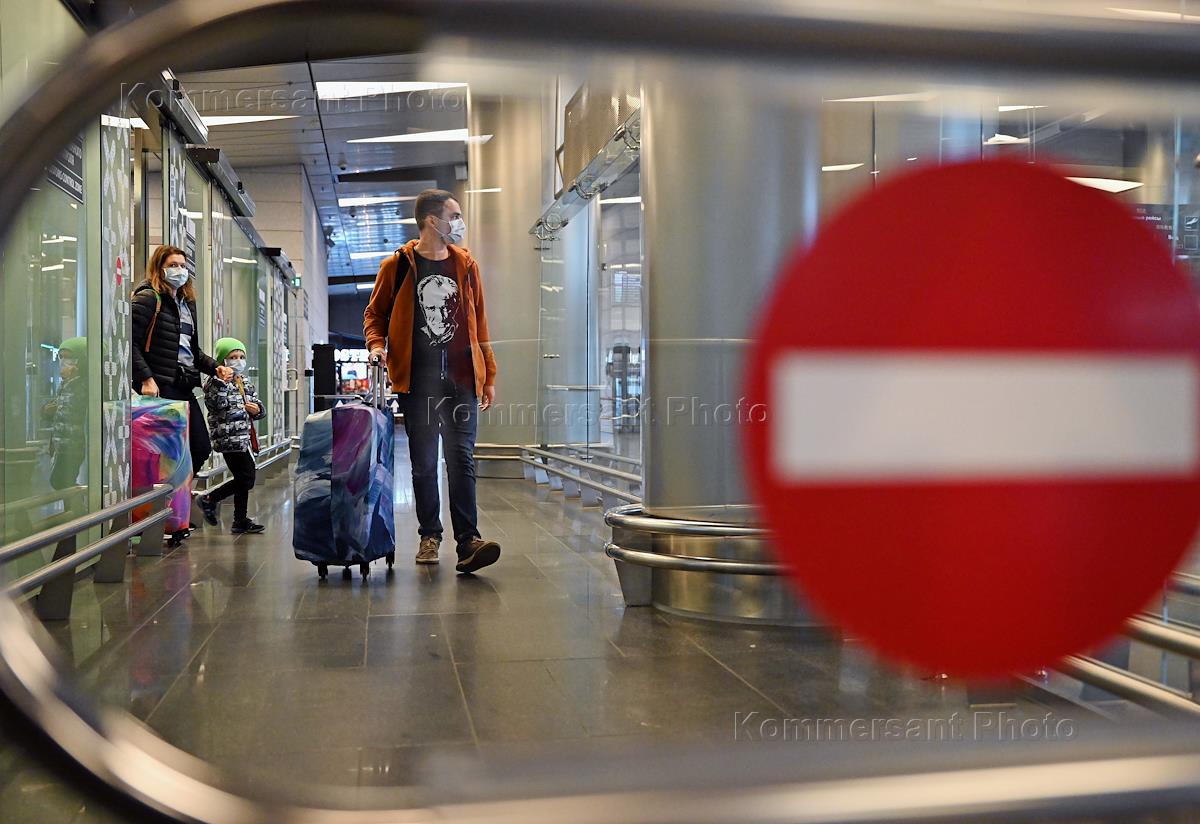 Международный аэропорт "Внуково". Прилет пассажиров из Черногории. Люди в защитных масках в зале…