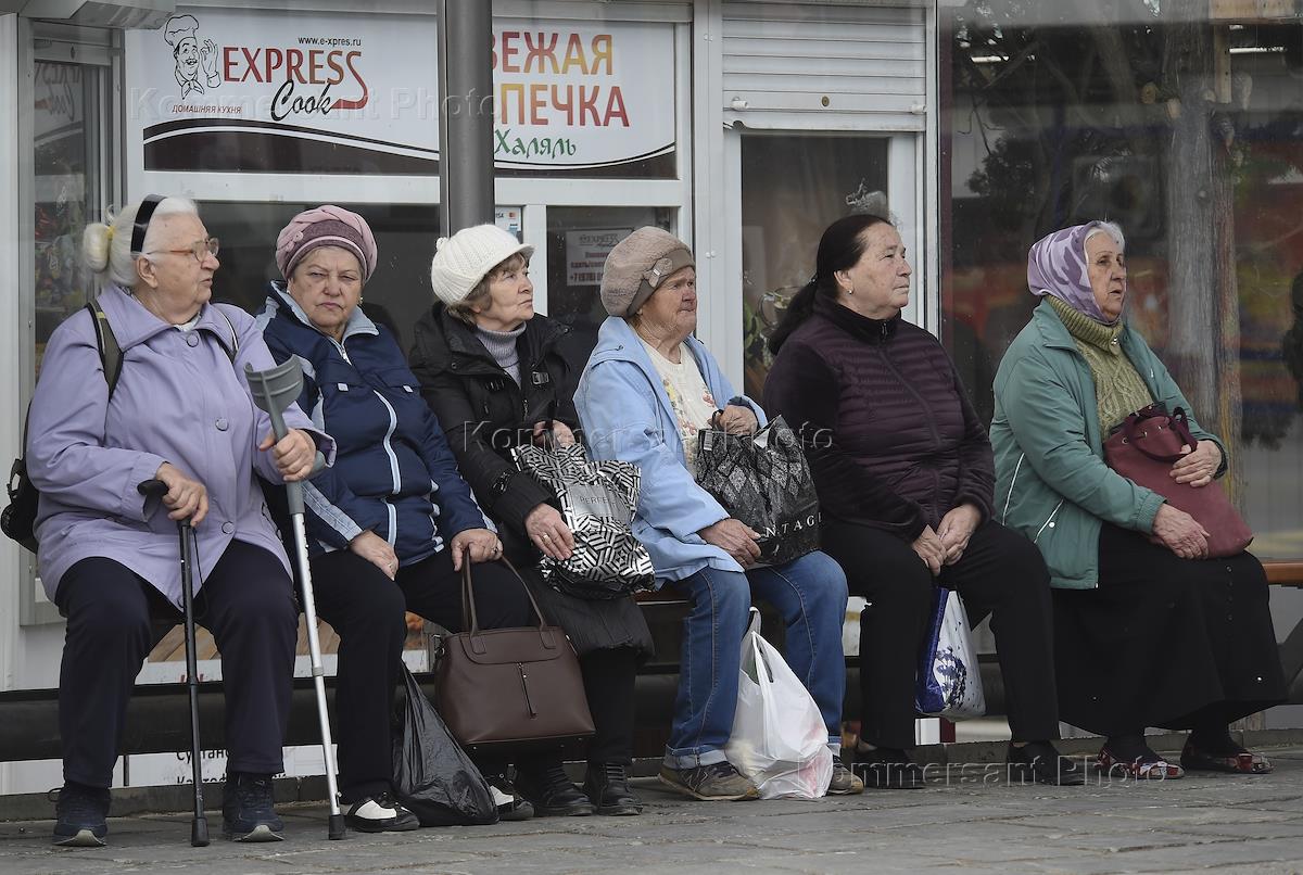 Жанровая фотография. Пожилые женщины сидят на лавочке остановки общественного транспорта.