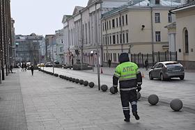 Москва во время пандемии коронавируса COVID-19. Жанровая фотография. Сотрудник дорожно-патрульной…
