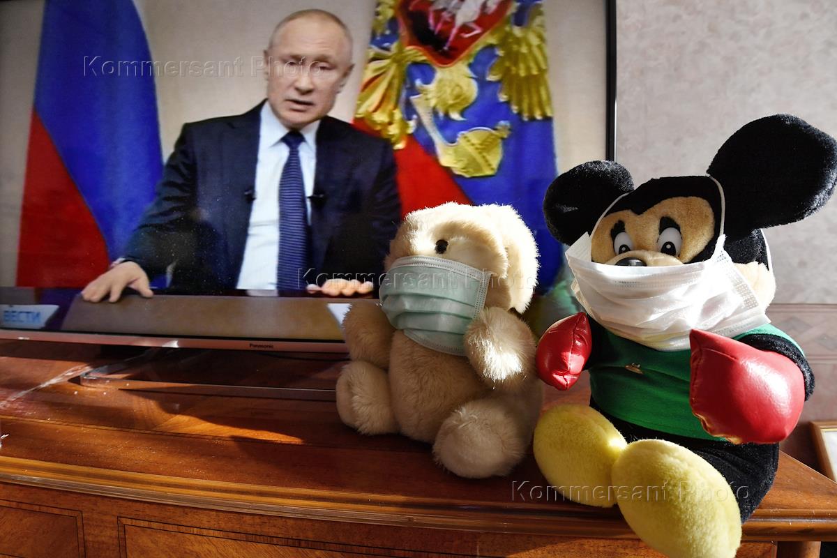 Трансляция обращения президента России владимира Путина по ситуации с распространением коронавирусу. Жанровые фотографии.
