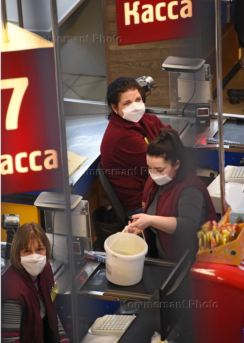 Меры предосторожности против коронавируса COVID-19. Жанровая фотография. Продавщица в медицинской…