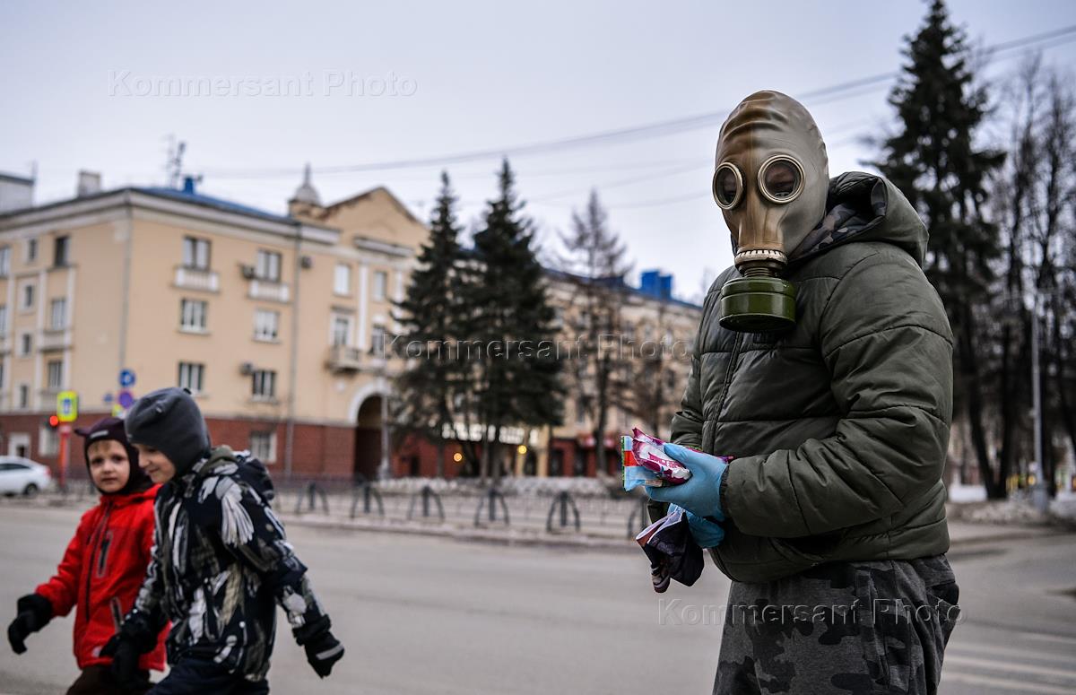 People in protective masks on the streets of Kemerovo during the coronavirus pandemic.
