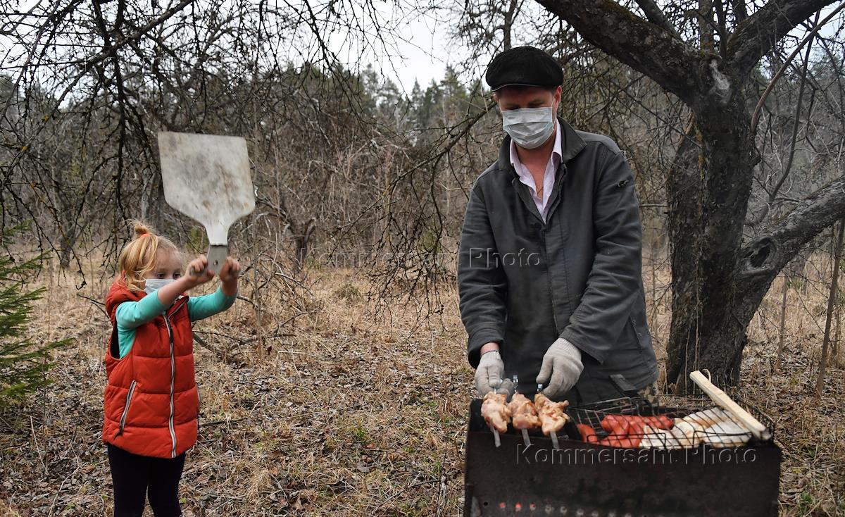 Виды Москвы во время карантина коронавируса COVID-19. Жанровая фотография. Люди отдыхают у дачного…