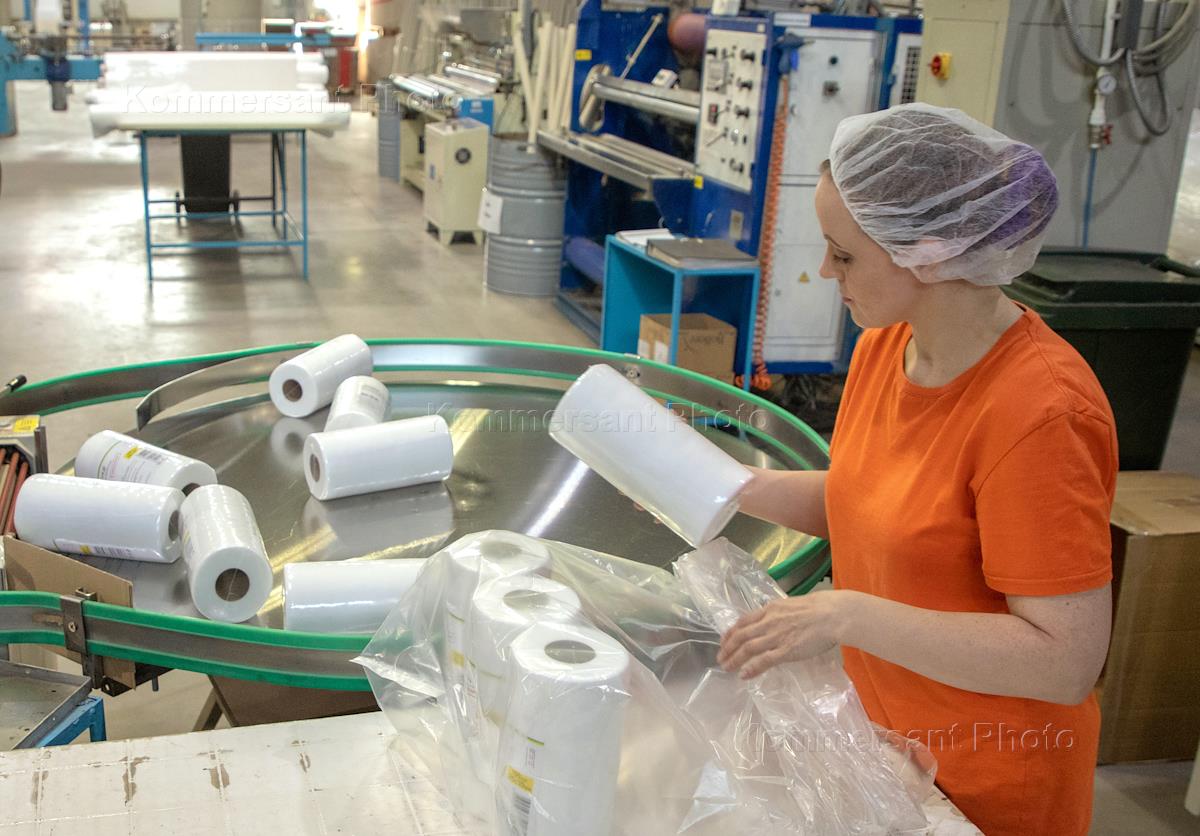 Жанровая фотография. Сотрудники предприятия "Афалина" на участке упаковки рулонных полотенец из…