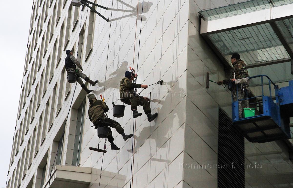 Работа промышленных альпинистов по помывке фасадов в Москве