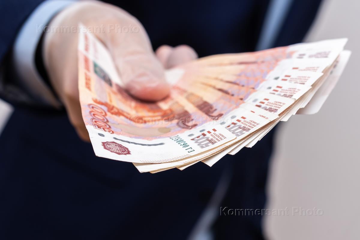 Жанровая фотография. Купюры достоинством 2000 рублей в руке мужчины в медицинской перчатке.