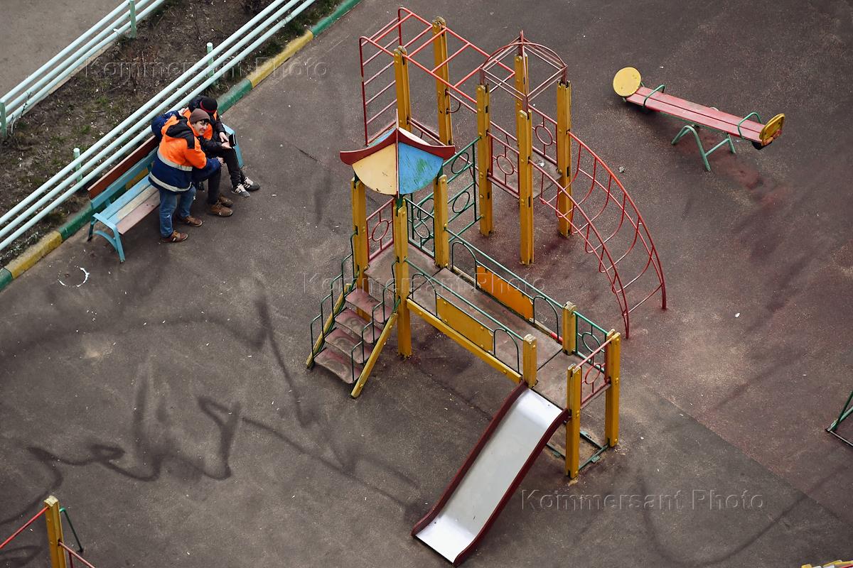 Окружающая среда Виды Москвы во время режима самоизоляции из-за опасности распространения коронавирусной инфекции COVID-19. Жанровая фотография. Детская площадка.