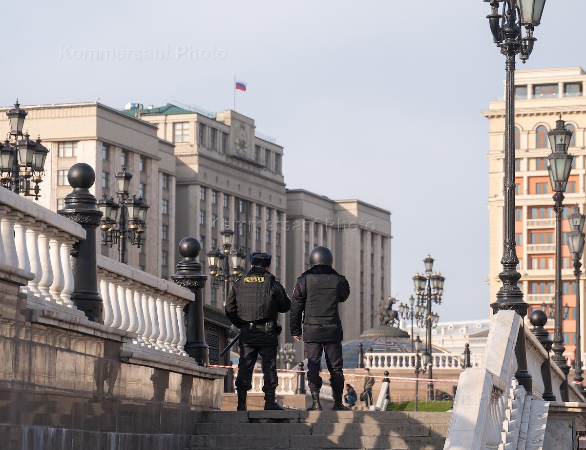 Сотрудники полиции и члены саперной бригады во время перекрытия Манежной площади в связи с…