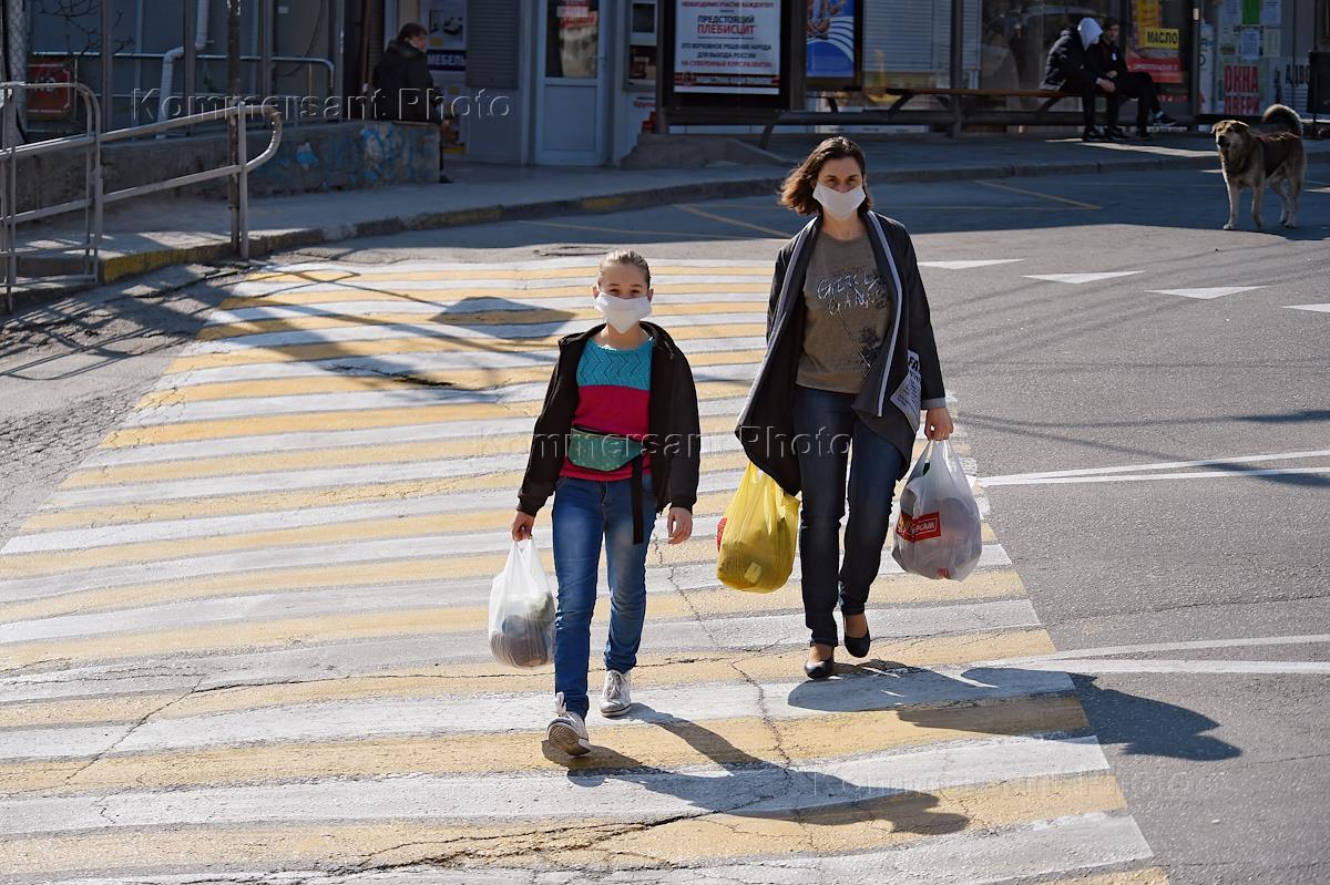 Виды Алушты во время карантина коронавируса COVID-19. Жанровая фотография. Женщина с девочкой в…