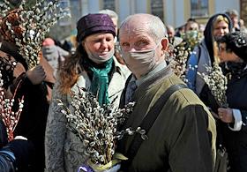 Празднование Входа Господня в Иерусалим (Вербное воскресенье) во время пандемии коронавируса COVID-19. Жанровая фотография. Прихожане во время освящения вербы в храме.