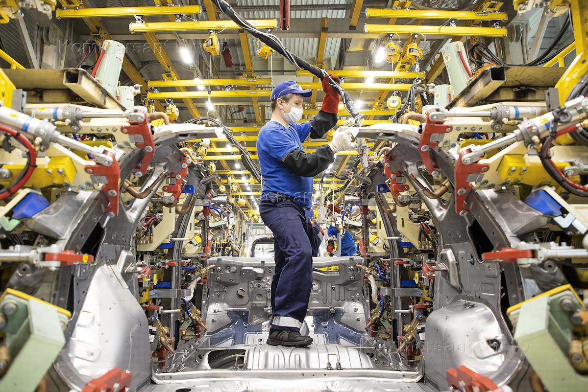 Экономика и бизнес Калининград во время режима самоизоляции из-за опасности распространения коронавирусной инфекции COVID-19. Жанровая фотография. Завод "Автотор" возобновил работу после двухнедельного перерыва. Меры предосторожности и профилактики от коронавируса на производстве.