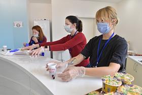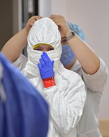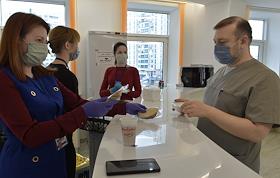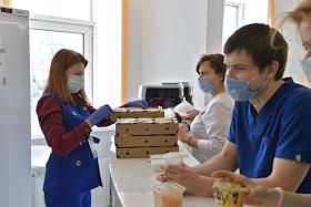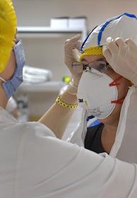 Медицина Работа волонтеров по организации питания сотрудников в инфекционном центре на базе Федерального центра мозга и нейротехнологий (ФГБУ "ФЦМН" МЗ РФ). Экипировка медицинского персонала перед входом в "красную зону".