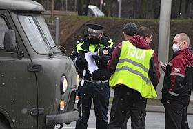 Общество Москва во время режима самоизоляции из-за опасности распространения коронавирусной инфекции COVID-19. Введение пропускного режима. Жанровая фотография. Сотрудники полиции во время проверки пропусков на передвижение по городу у пассажиров при входе на станцию Московского метрополитена.