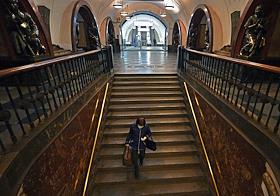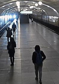 Общество Москва во время режима самоизоляции из-за опасности распространения коронавирусной инфекции COVID-19. Введение пропускного режима. Жанровая фотография. Сотрудники полиции во время проверки пропусков на передвижение по городу у пассажиров при входе на станцию Московского метрополитена.