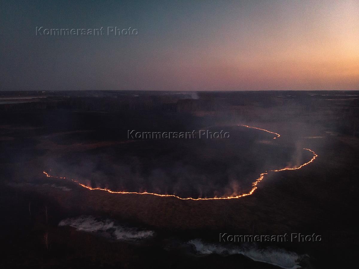 Жанровая фотография. Весенний пал травы. Горящее поле рядом с рабочим поселком Линёво.