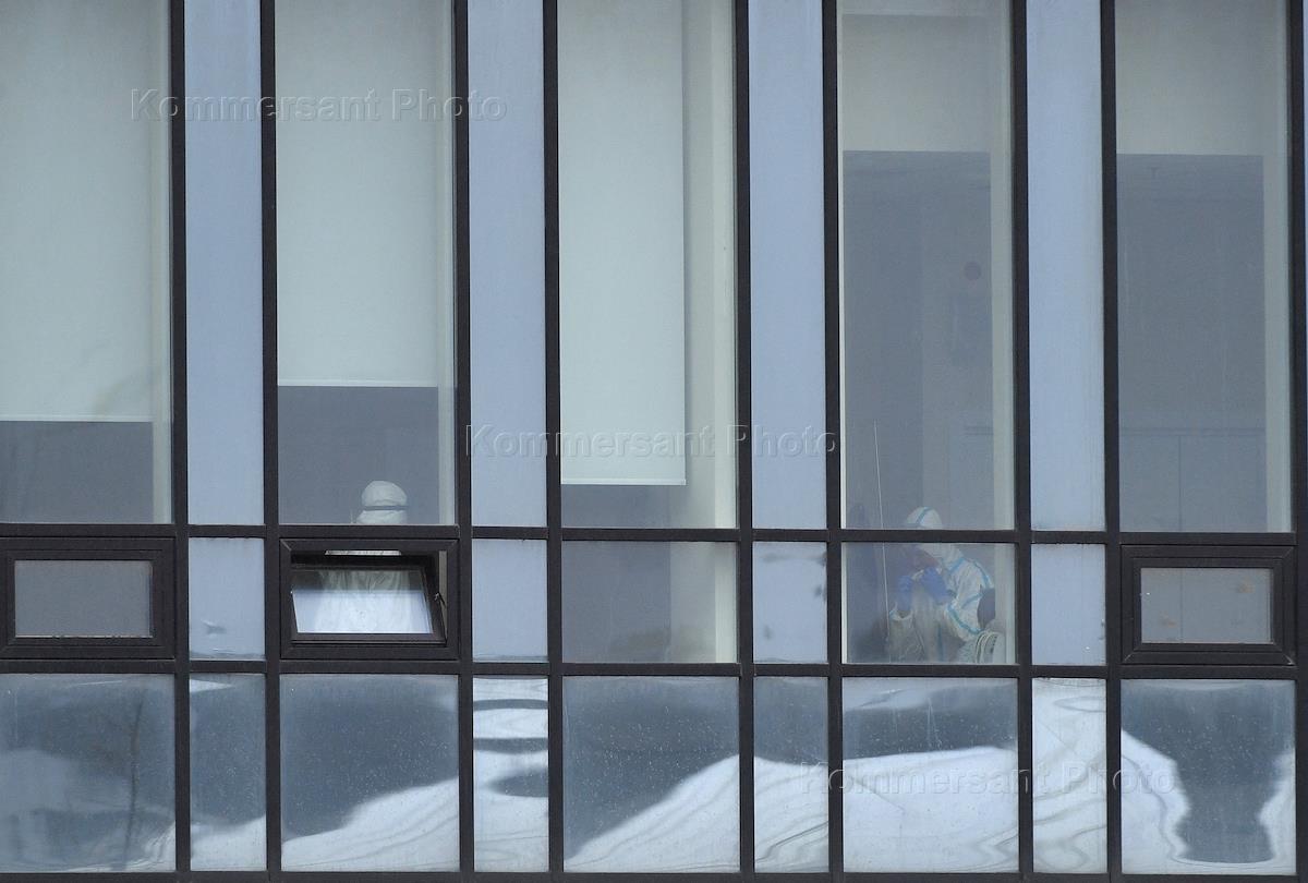 Медицина Москва во время режима самоизоляции из-за опасности распространения коронавирусной инфекции COVID-19. Жанровая фотография. Медицинский центр "Новомосковский" в поселке Коммунарка Новой Москвы.