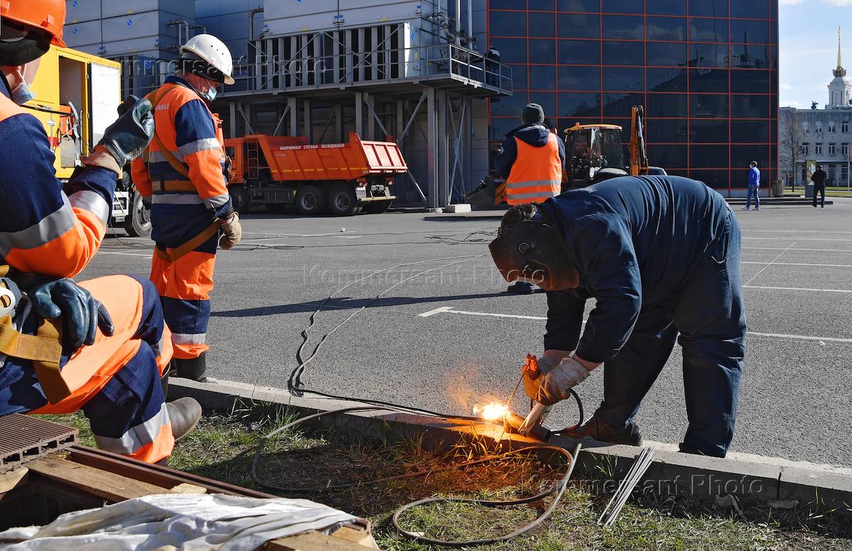 Медицина Москва во время режима самоизоляции из-за опасности распространения коронавирусной инфекции COVID-19. Жанровая фотография. Установка временного госпиталя для приема пациентов с коронавирусной инфекцией на территории ВДНХ.