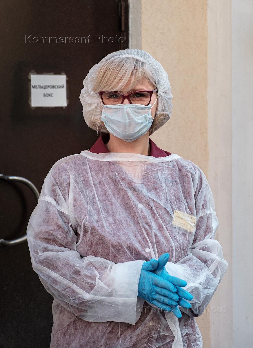 Сотрудники больницы и врачи скорой медицинской помощи на территории городской клинической инфекционной больницы №1 у приемного отделения.