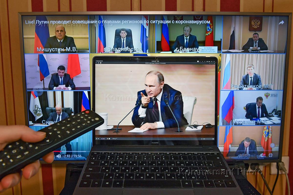 Политика Трансляция выступления президента России Владимира Путина перед совещанием в режиме видеоконференции с главами регионов по вопросам противодействия распространению коронавирусной инфекции COVID-19.