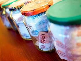 Жанровая фотография. Сбережения и вклады. Стеклянные банки с бумажными купюрами различного…