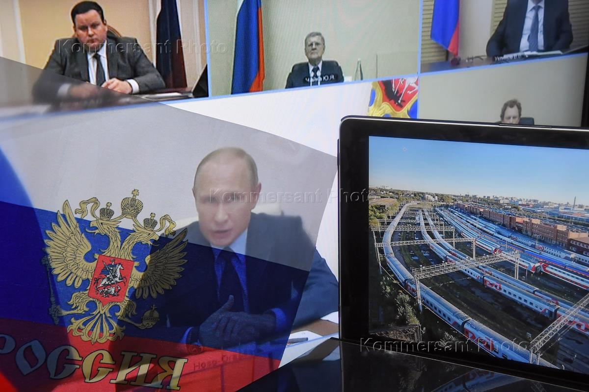 Политика Режим самоизоляции из-за опасности распространения коронавирусной инфекции COVID-19. Жанровая фотография. Трансляция совещания президента России Владимира Путина по вопросам развития транспортной отрасли в режиме видеоконференции.