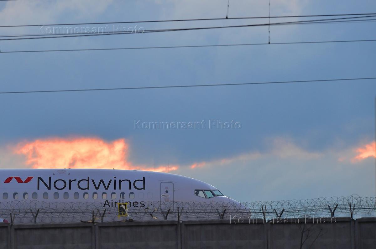 Жанровая фотография. Закатное небо над взлетной полосой аэропорта. Самолет авиакомпании Nordwind…