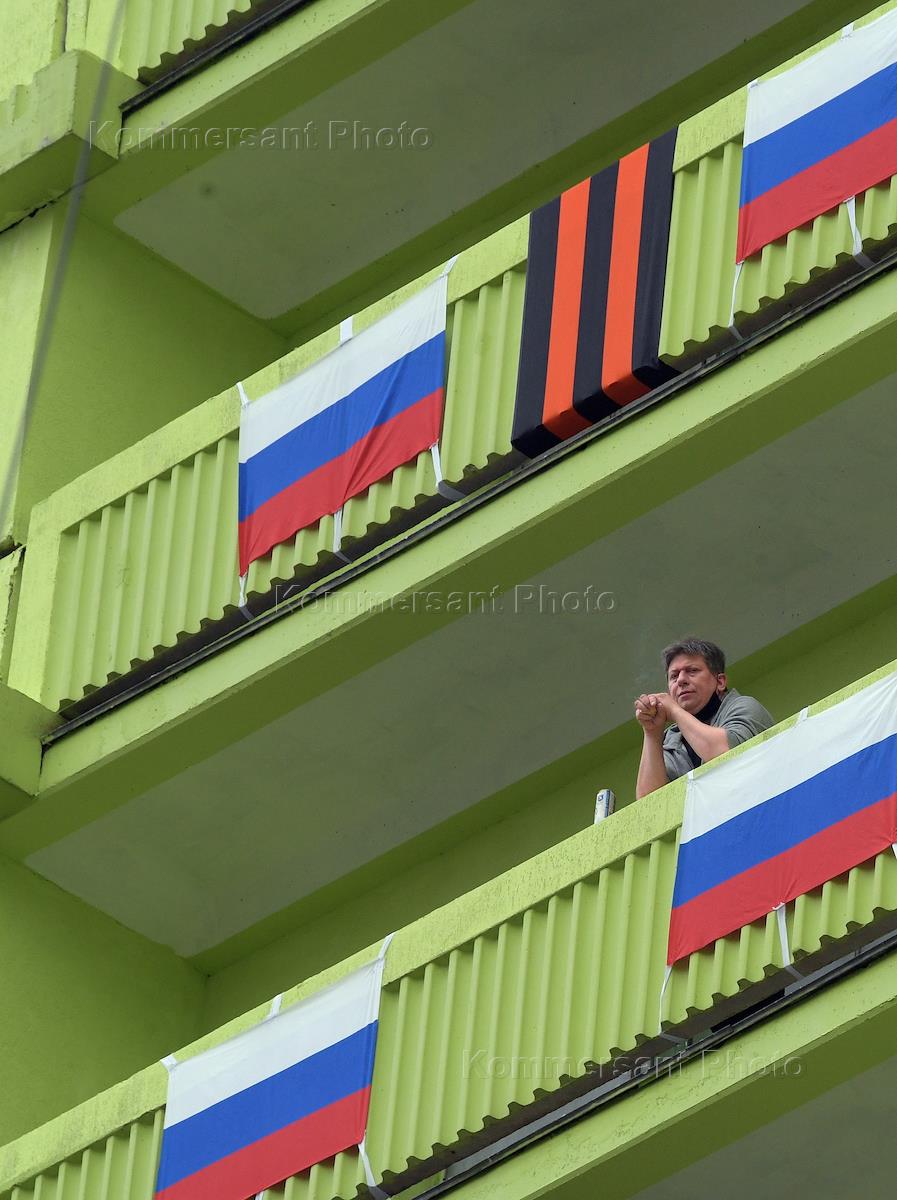 Исполнение песни "День Победы" на балконах жителями многоквартирных домов.
