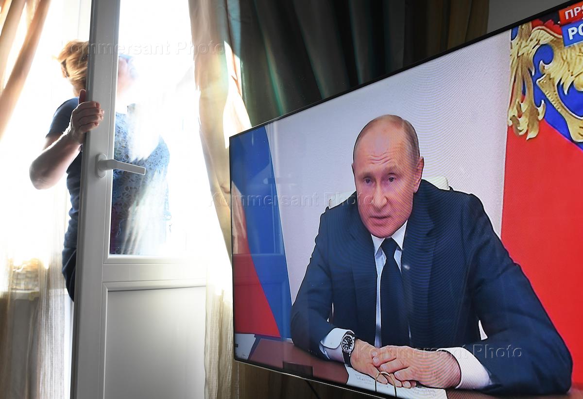 Политика Режим самоизоляции из-за опасности распространения коронавирусной инфекции COVID-19. Жанровая фотография. Трансляция обращения президента России Владимира Путина к гражданам России о санитарно-эпидемиологической обстановке и новых мерах по поддержке граждан и экономики страны.