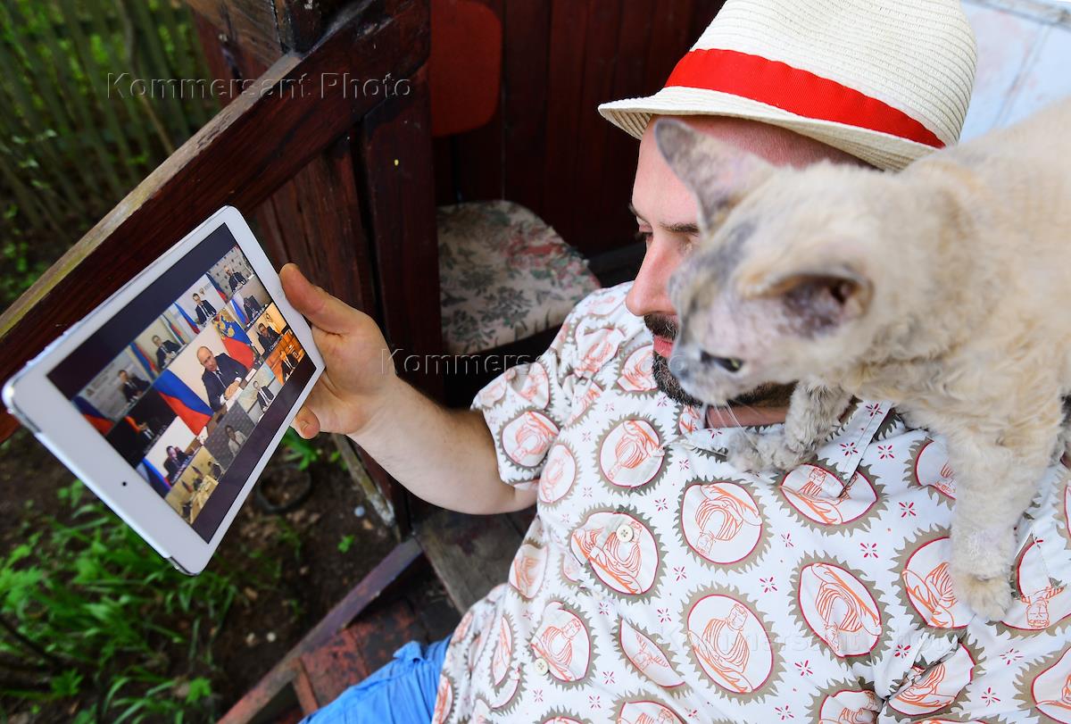 Политика Режим самоизоляции из-за опасности распространения коронавирусной инфекции COVID-19. Жанровая фотография. Трансляция совещания президента России Владимира Путина по вопросам борьбы с пандемией коронавируса COVID-19 в стране, в режиме видеоконференции.