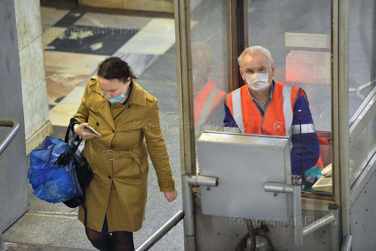 Экономика и бизнес Москва во время режима самоизоляции из-за опасности распространения коронавирусной инфекции COVID-19. Жанровая фотография. В Москве и области вводится режим обязательного ношения масок и перчаток в общественном транспорте. Пассажиры в метро.