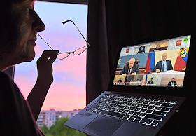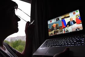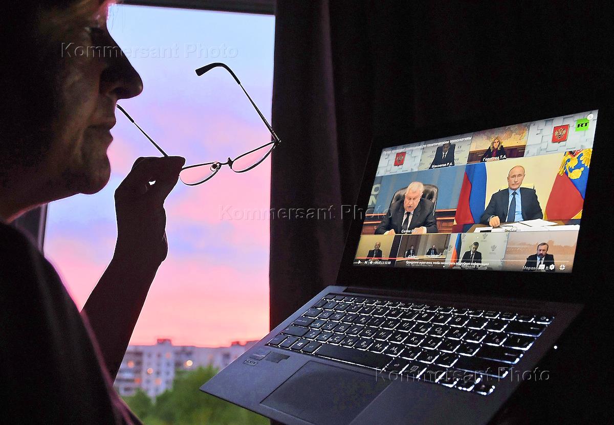 Политика Режим самоизоляции из-за опасности распространения коронавирусной инфекции COVID-19. Жанровая фотография. Трансляция совещания президента России Владимира Путина в режиме видеоконференции о развитии генетических технологий в России.