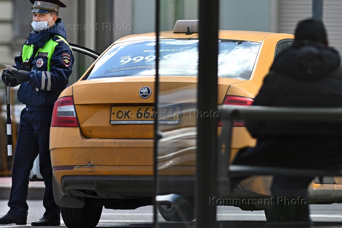 Окружающая среда Москва во время режима самоизоляции из-за опасности распространения коронавирусной инфекции COVID-19. Жанровая фотография. Масочный режим. Проверка документов. Трафик на дорогах.