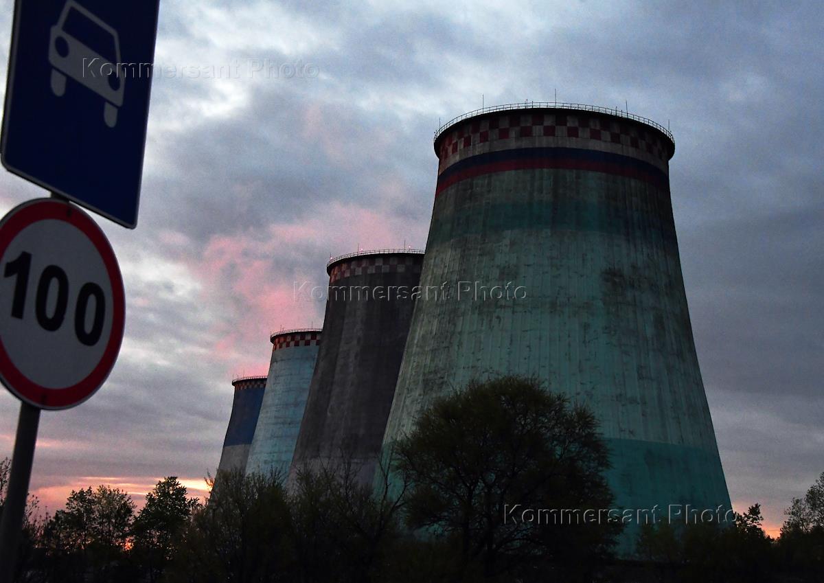 Genre photo. Ecology. CHP plant pipes with the power transmission lines in the background.
