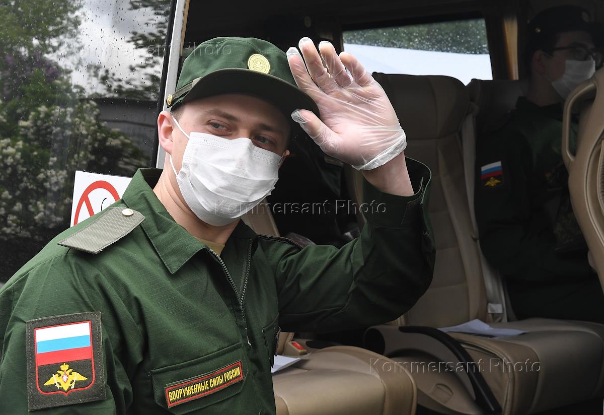 Армия и ВПК Весенняя призывная кампания во время режима самоизоляции из-за опасности распространения коронавирусной инфекции COVID-19. Жанровая фотография. Сборный призывной пункт Военного комиссариата города Москвы.