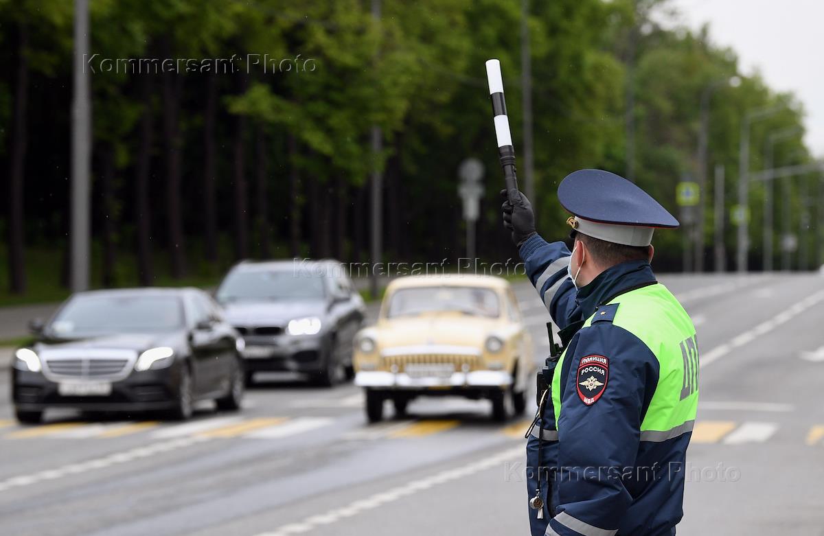 Правосудие Режим самоизоляции из-за опасности распространения коронавирусной инфекции COVID-19. Жанровая фотография. Патрулирование и проверка документов у мотоциклистов.