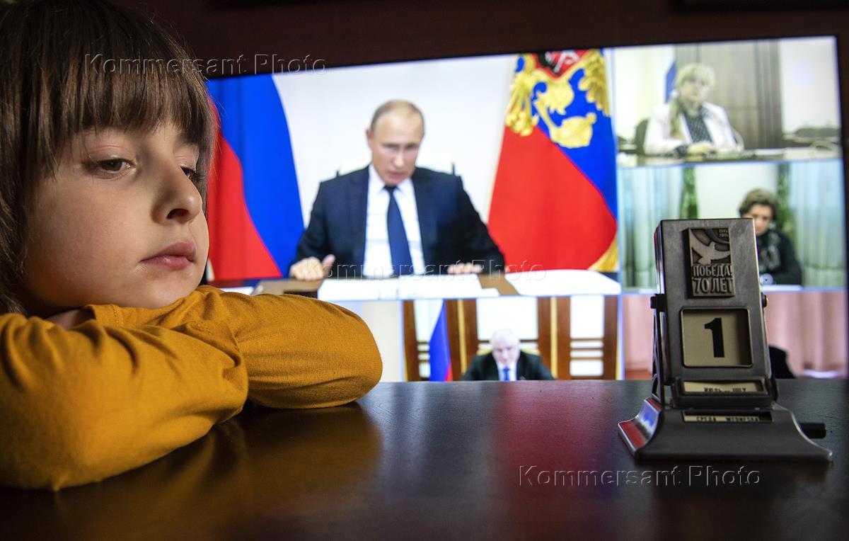 Genre photo. Live broadcast of Russian President Vladimir Putin's videoconference with the…