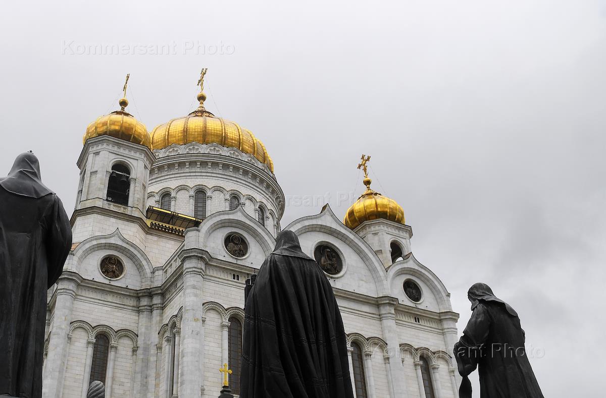 Религия Москва во время режима самоизоляции из-за опасности распространения коронавирусной инфекции COVID-19. Жанровая фотография. Храм Христа Спасителя открылся для прихожан. Богослужение в Преображенской церкви храма Христа Спасителя.