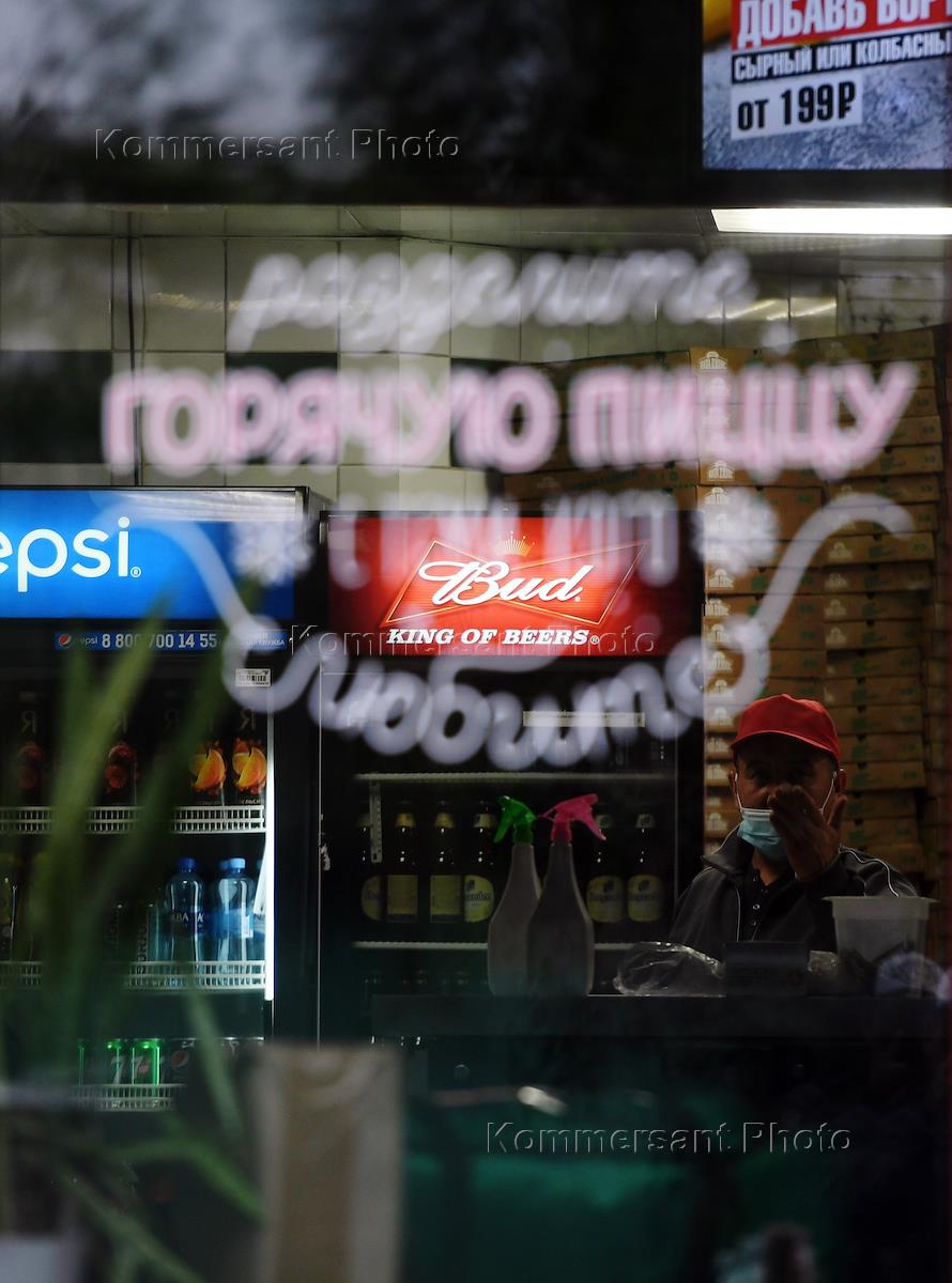 Жанровая фотография. Посетитель в медицинской маске в пиццерии Papa John's ("Папа Джонс").