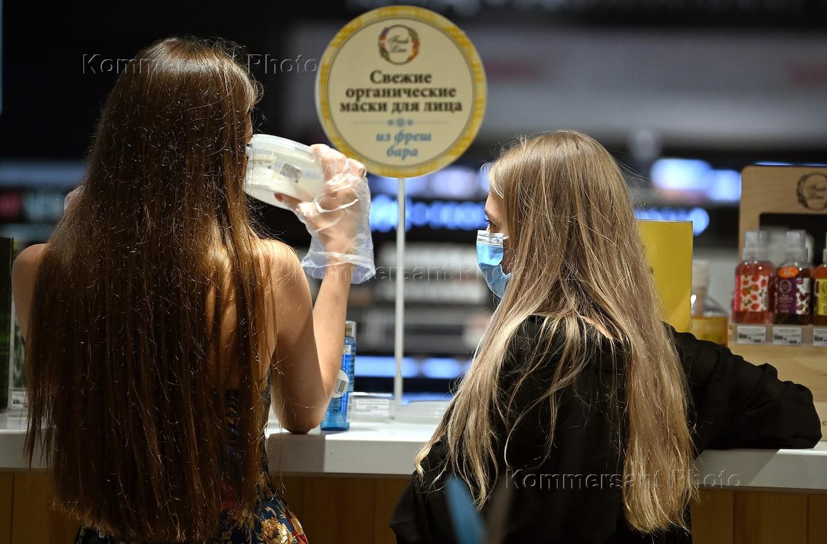 Жанровая фотография. Покупательницы в медицинских масках во время покупки косметических средств.