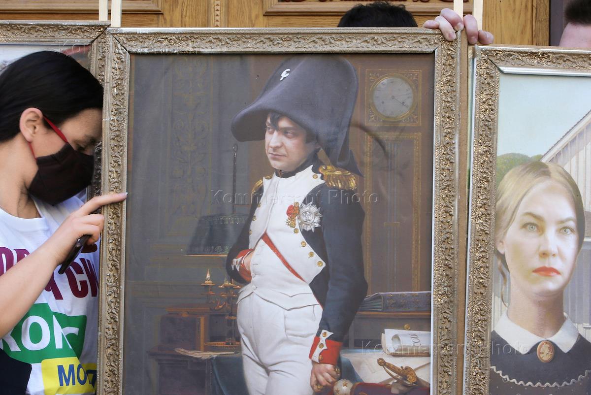 Политика Экс-президент Украины, депутат Верховной рады Украины Петр Порошенко, вызванный на допрос в Государственное бюро расследований по делу о прослушке его переговоров с бывшим вице-президентом США Джо Байденом. У здания ГБР собрались активисты для поддержки Петра Порошенко, которые принесли с собой репродукции картины известных авторов с коллажами украинских политиков - Зеленского, Коломойского, Венедиктовой.