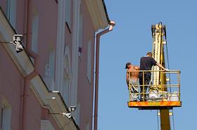 Виды Гомеля. Жанровая фотография. Рабочие на подъемнике ремонтируют фасад здания.