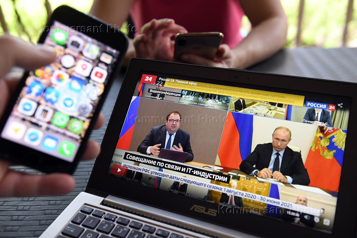 Жанровая фотография. Президент России Владимир Путин провел в режиме видеоконференции совещание по информационным технологиям и связи.
