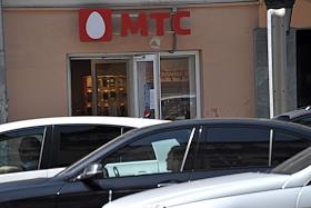Жанровая фотография. Вывеска и логотип мобильного оператора "МТС" над входом в салон сотовой связи.